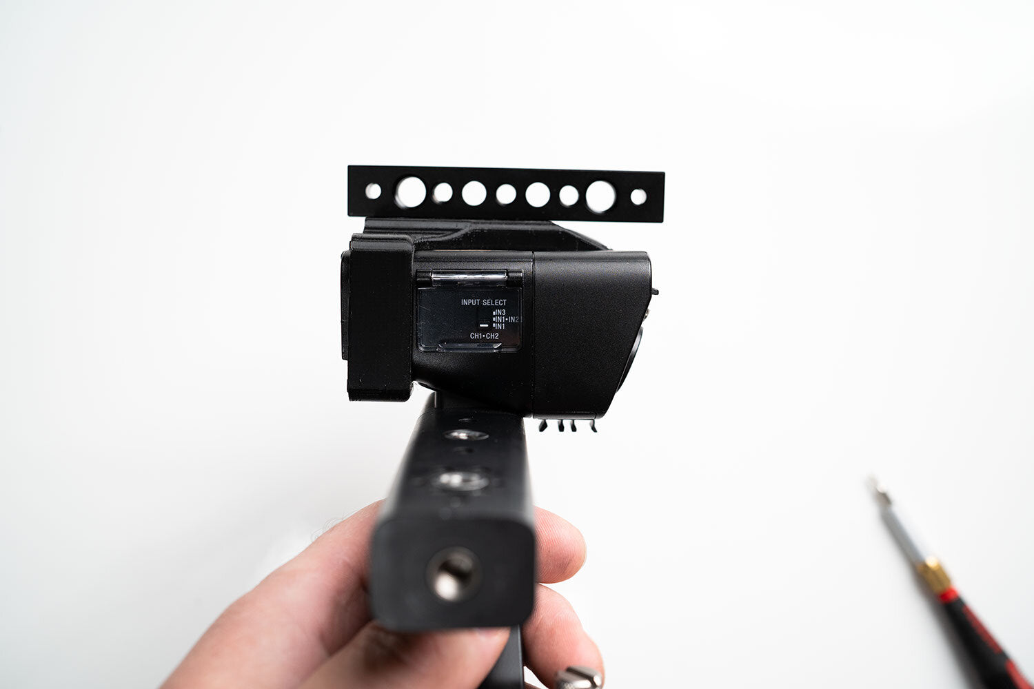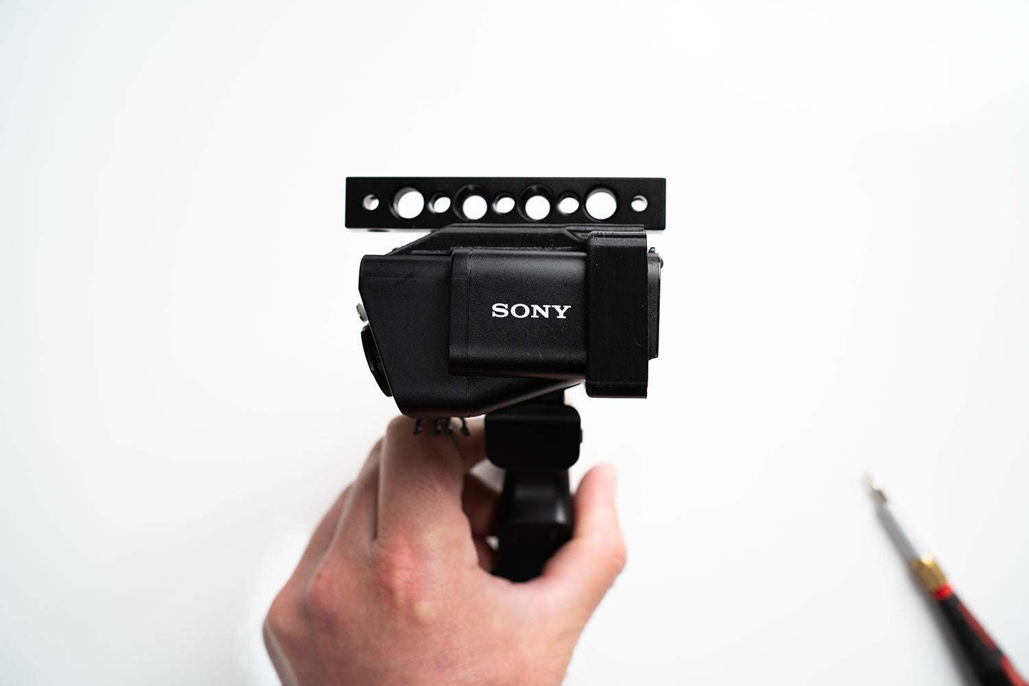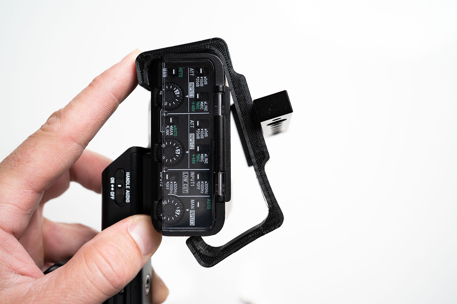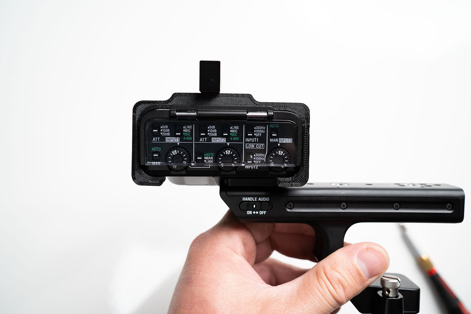 This is a 3D Printed top handle mount for the Sony FX3. This 3D printed mount surrounds the top handle mic input box and provides a forward top handle mounting point.
